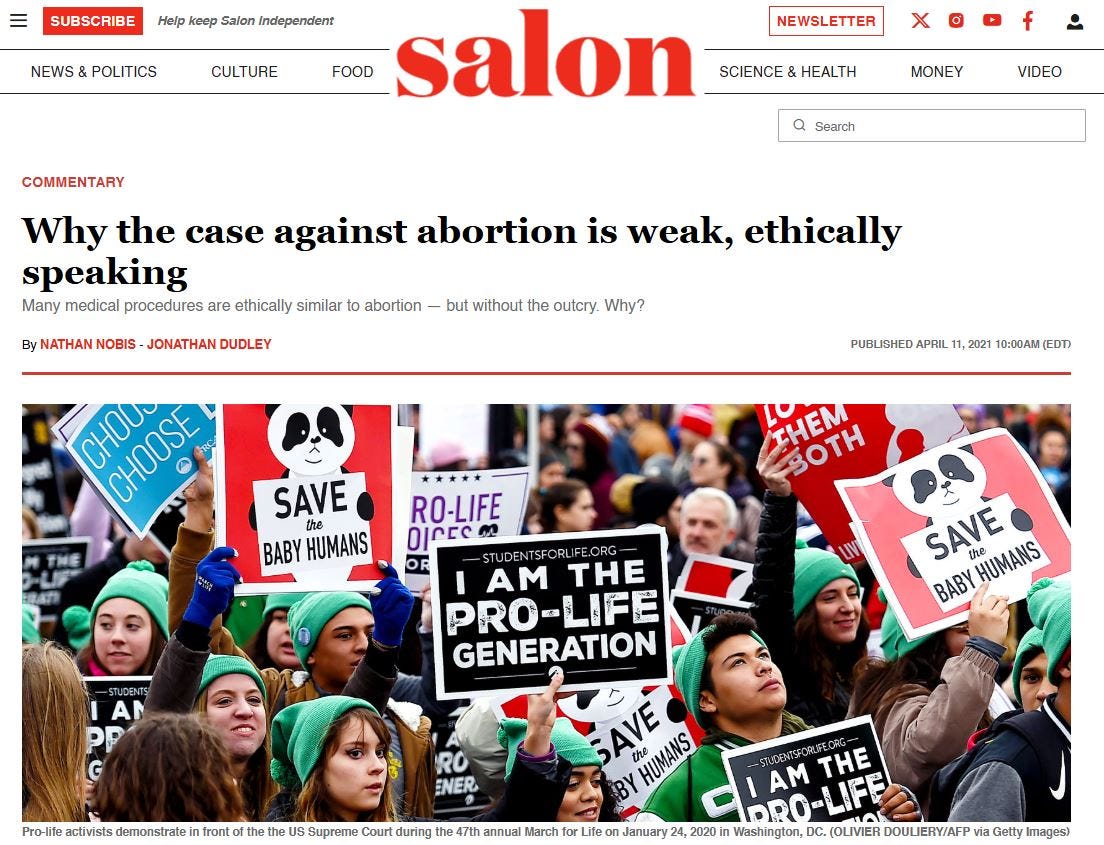 [1] Nathan Nobis and Jonathan Dudley, “Why the Case against Abortion Is Weak, Ethically Speaking,” Salon, April 11, 2021: salon.com/2021/04/11/why-the-case -against-abortion-is-weak-ethically-speaking The main argument of this article is also made in Nathan Nobis and Kristina Grob, Thinking Critically About Abortion (Open Philosophy Press, 2019), AbortionArguments.com and Nathan Nobis, “Early and Later Abortions: Ethics and Law,” in Bob Fischer, ed., Ethics, Left and Right: The Moral Issues that Divide Us (Oxford University Press, 2019).